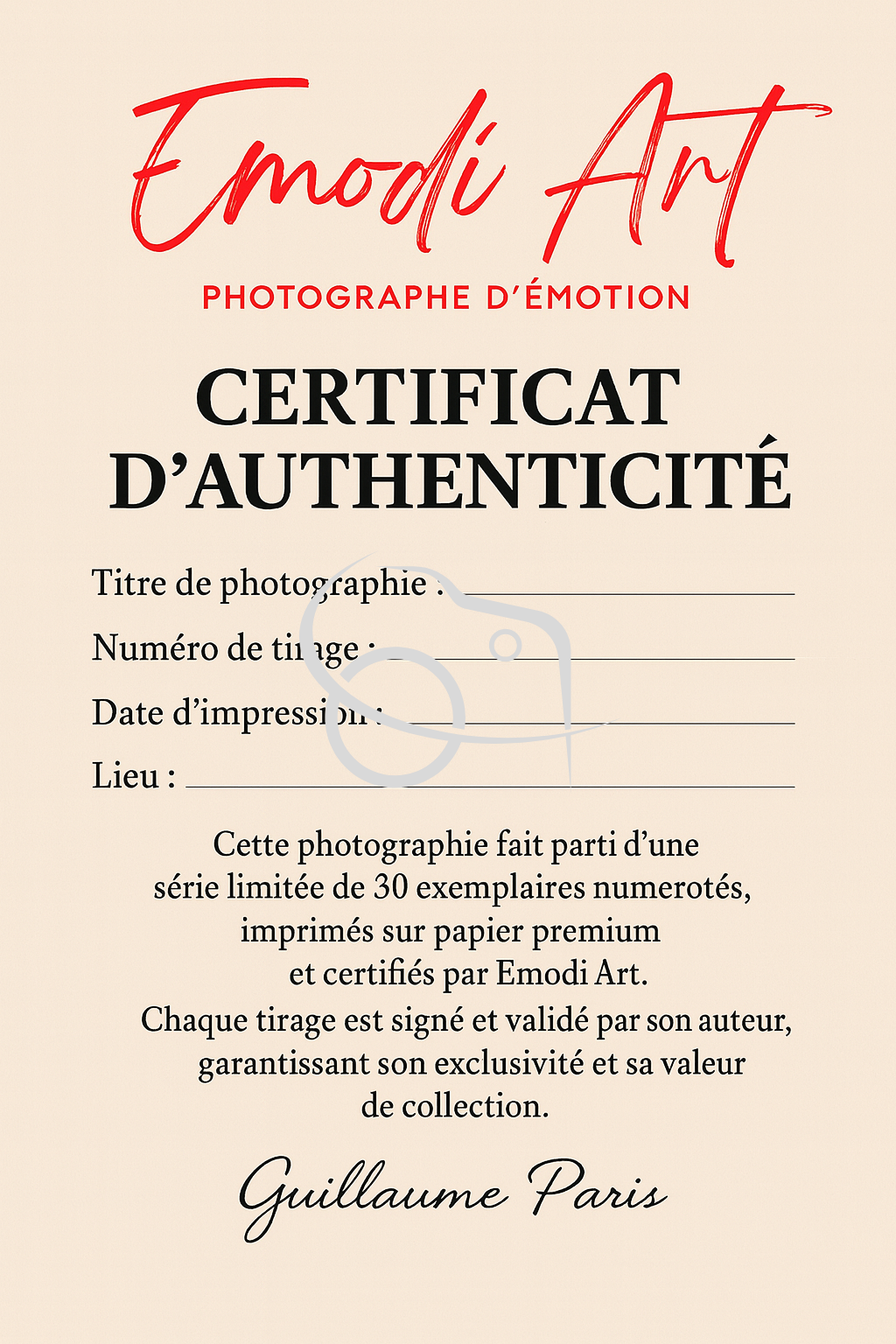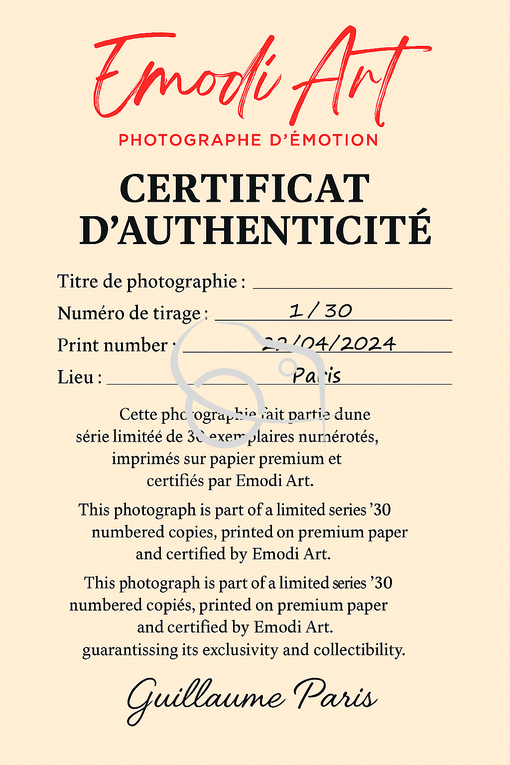 Chaque photo possède son certificat d’authenticité comprenant le numéro de tirage limité à 30 exemplaires, le titre de la photo, la date , lieu et la signature du photographe et son nom.